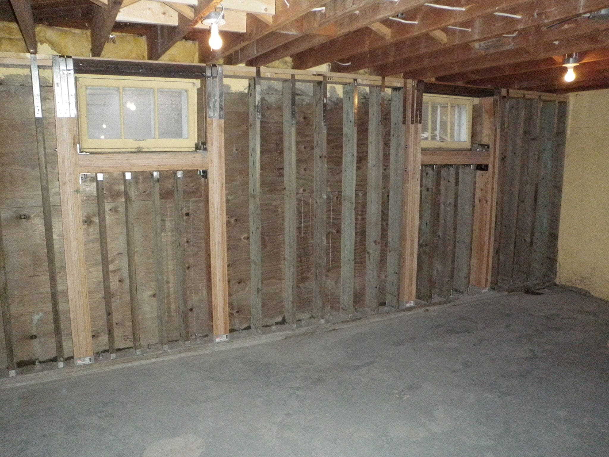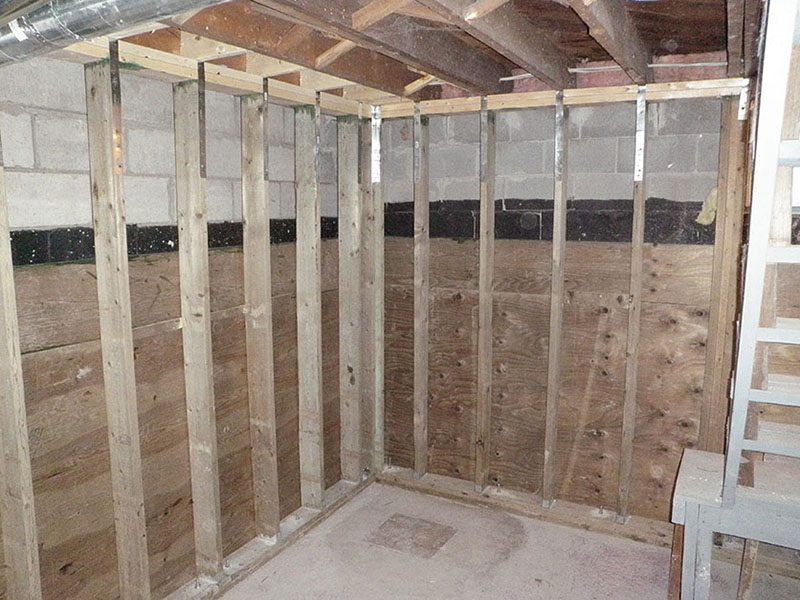 The reinforcement wall is constructed using treated structural lumber and anchored securely to provide lateral support to the existing PWF foundation wall. In some cases, additional footing support may be installed to improve stability and load transfer.